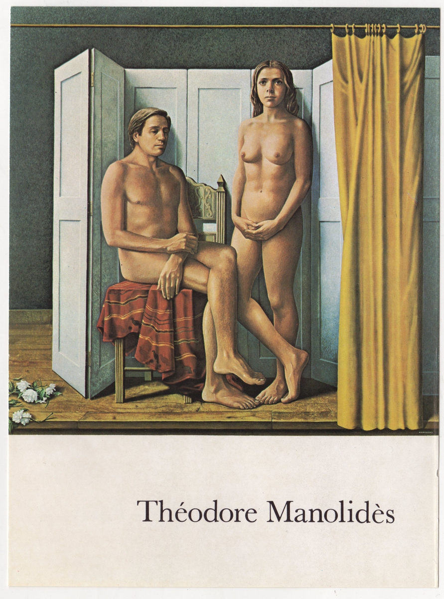 Πρόσκληση, χαρτί ιλλουστρασιόν, 21×15,5 εκ., εγκαινίων ατομικής έκθεσης του Θεόδωρου Μανωλίδη. Η έκθεση διοργανώνεται στο πλαίσιο της Μπιενάλε Παρισιού. Το έντυπο εικονογραφείται.