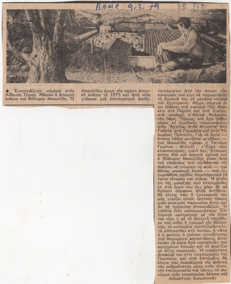 Απόκομμα, χαρτί ακανόνιστου μεγέθους, στα ελληνικά, δημοσίευσης άρθρου αναφερόμενου στα εγκαίνια ατομικής έκθεσης ζωγραφικής του Θεόδωρου Μανωλίδη.