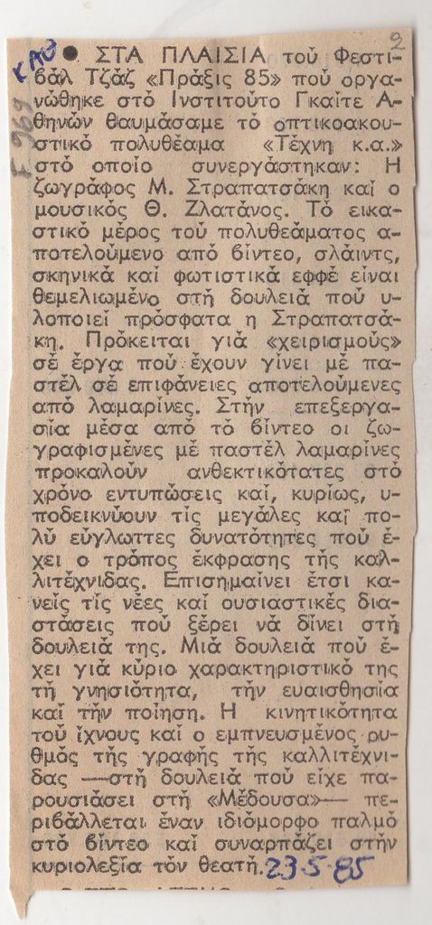 Απόκομμα, χαρτί, 11×5 εκ., στα ελληνικά, δημοσίευσης κειμένου αναφερόμενου σε οπτικοακουστικό θέαμα της Μαριάννας Στραπατσάκη, που παρουσιάστηκε σε συνεργασία με τον μουσικό Θ. Ζλάτανο στο Γκαίτε Αθηνών, στο πλαίσιο Φεστιβάλ Τζαζ με τίτλο “Πράξις 85”. Το απόκομμα φέρει επιγραφή.