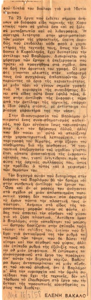 Αποκόμμα, χαρτί, 5×5 και 16,3×5,5 εκ., στα ελληνικά, δημοσίευσης κριτικής έκθεσης του Γιώργου Βαρλάμου, η οποία διεξάγεται στην Αίθουσα Εκθέσεων Κούρος στην Αθήνα.