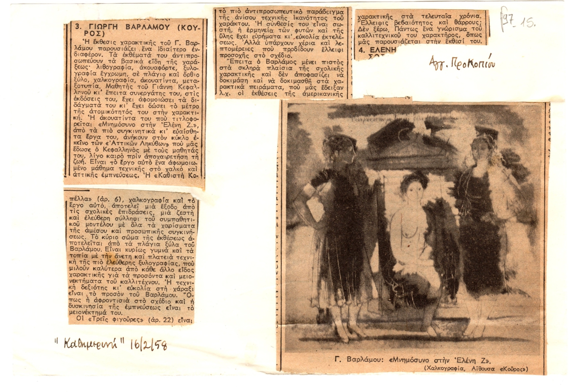 Αποκόμματα εντύπου (5) κολλημένα σε λευκή κόλλα διαστάσεων 14×21,3 εκ., στα ελληνικά δημοσίευσης κριτικής του Άγγελου Προκοπίου για την ατομική έκθεση του Γιώργου Βαρλάμου στην Αίθουσα Εκθέσεων Κούρος στην Αθήνα.