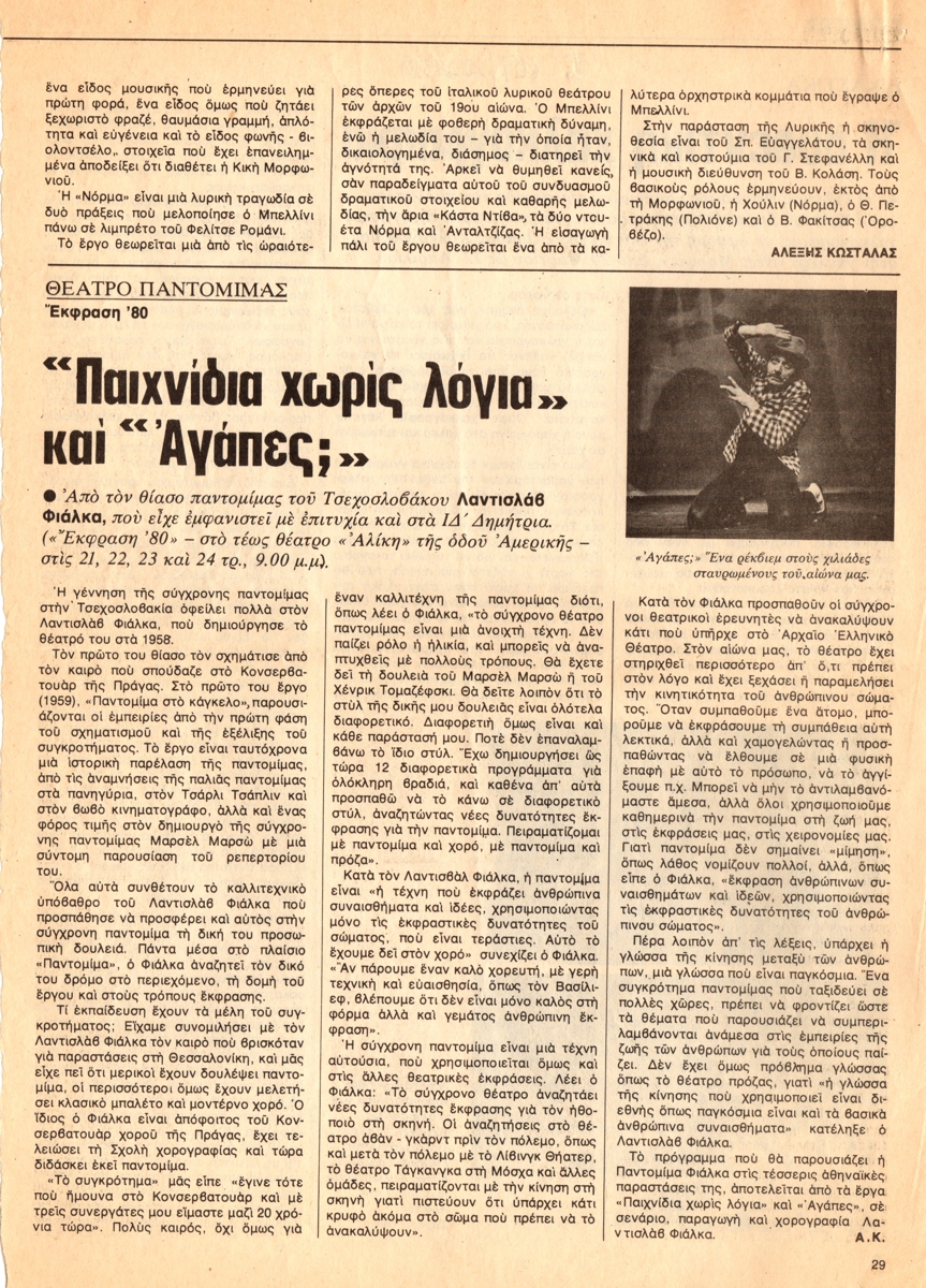 Απόκομμα, χαρτί, 28, 5×20,5 εκ., στα ελληνικά, δημοσίευσης άρθρου το οποίο αναφέρεται στο θέατρο Παντομίμας που παρουσιάστηκε στην Αθήνα από τον Τσέχο καλλιτέχνη Λαντισλάβ Φιάλκα. Εντάσσεται στη στήλη “Θέατρο Παντομίμας”.