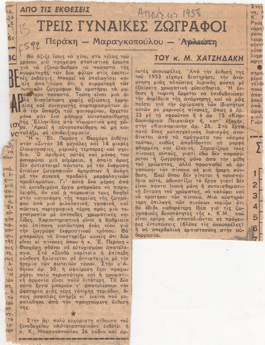 Απόκομμα, χαρτί, 14,5×11 εκ., στα ελληνικά, δημοσίευσης κριτικής εκθέσεων των Ελένης Περάκη, Κούλας Αναγνωστοπούλου και Λίλης Αρλιώτη στην Αθήνα.