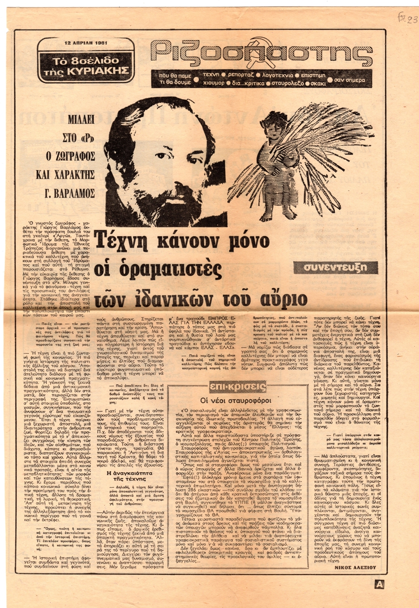 Απόκομμα, χαρτί, 43×30 εκ., στα ελληνικά, δημοσίευσης συνέντευξης του Γιώργου Βαρλάμου, με αφορμή έκθεσή του στην γκαλερί Αργώ.