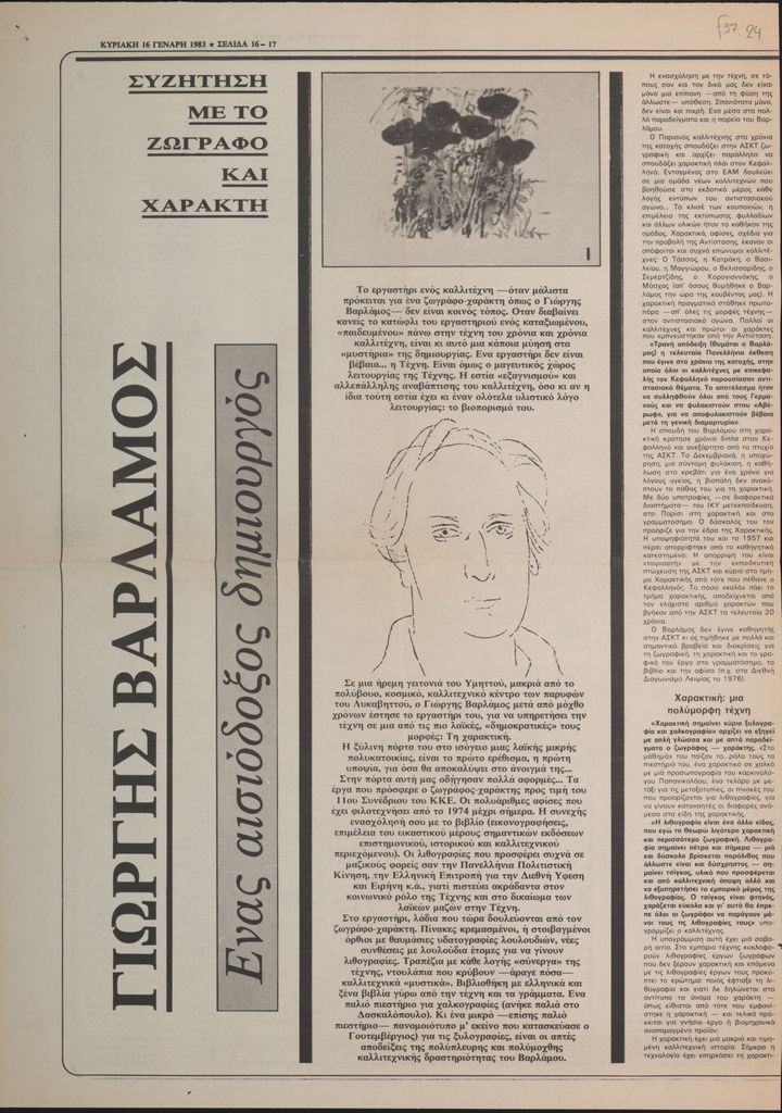 Απόκομμα, χαρτί, 2 φφ, 43×30 εκ., στα ελληνικά, δημοσίευσης συνέντευξης του Γιώργου Βαρλάμου.
