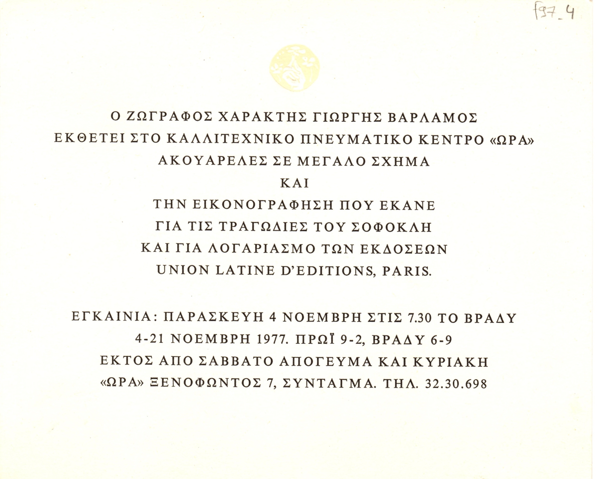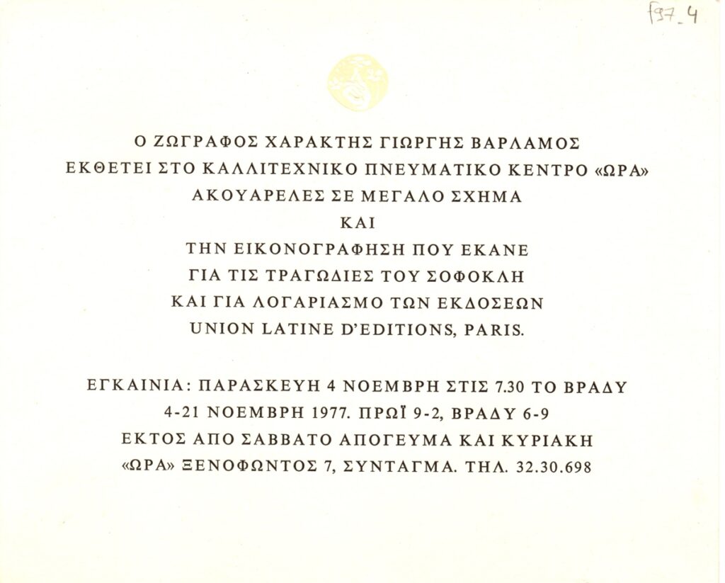 Πρόσκληση, χαρτόνι, 17×20,5 εκ., στα ελληνικά, ατομικής έκθεσης του Γιώργη Βαρλάμου.