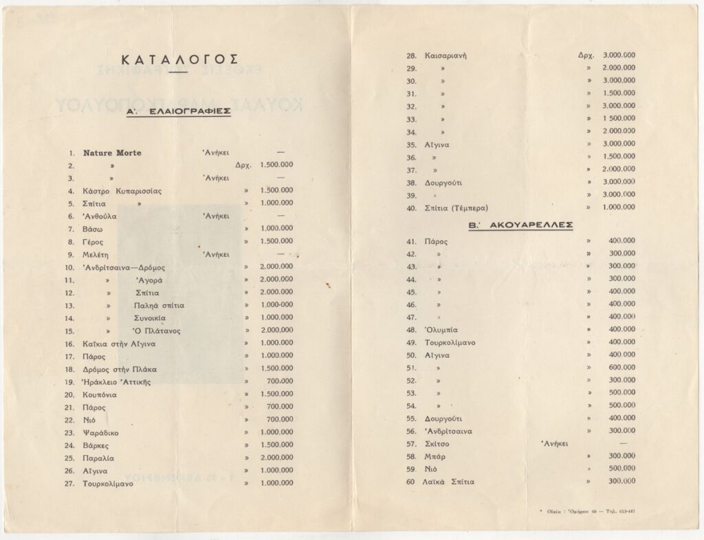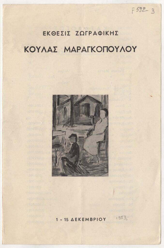 Έντυπο, χαρτί αναδιπλωμένο, 25×16,5 εκ., στα ελληνικά, ατομικής έκθεσης ζωγραφικής της Κούλας Μαραγκοπούλου. Περιέχει τιμοκατάλογο έργων και εικονογράφηση.