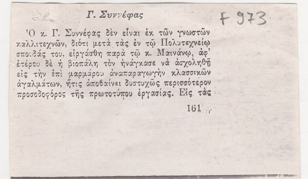 Φωτοαντίγραφο, χαρτί, 2 φφ, 29×21 και 6.5×11 εκ., στα ελληνικά, δημοσίευσης άρθρου που αναφέρεται στο εικαστικό έργο του Γεώργιου Συννέφα.