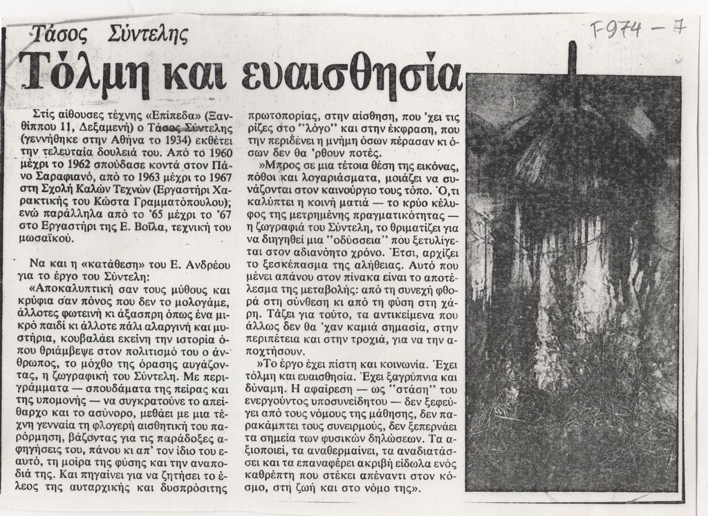 Φωτοαντίγραφο, χαρτί, 14×19,5 εκ., στα ελληνικά, δημοσίευσης κριτικής έκθεσης του Τάσσου Σύντελη, η οποία διεξάγεται στις Αίθουσες Τέχνης Επίπεδα στην Αθήνα. Αναγράφεται κριτική του Ευάγγελου Ανδρέου για το έργο του καλλιτέχνη.