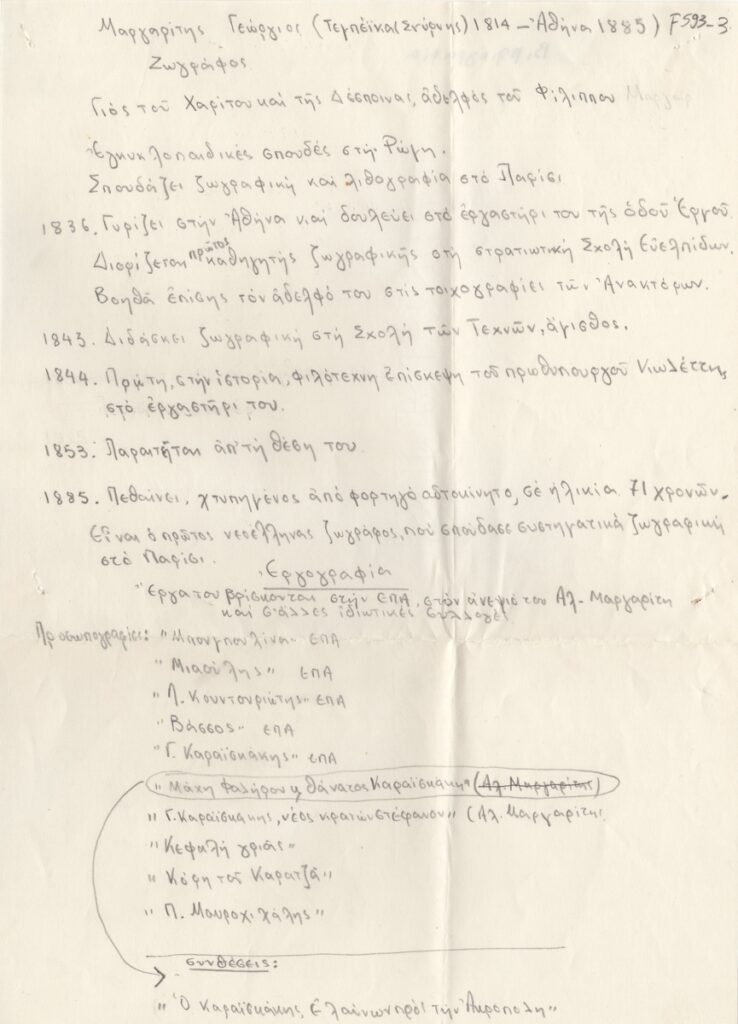 Βιογραφικό, χειρόγραφο, χαρτί, 29,5×21 εκ., στα ελληνικά, του Γεώργιου Μαργαρίτη. Περιέχει προσωπικές πληροφορίες, σπουδές και εργογραφία.