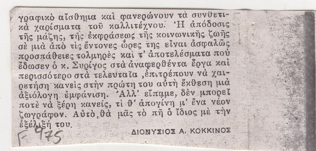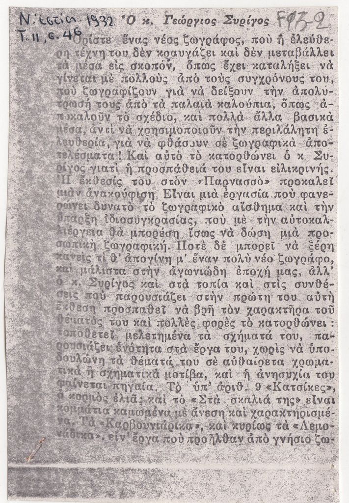 Φωτοαντίγραφο, χαρτί, 12×8 και 4,5×7 εκ., στα ελληνικά, δημοσίευσης κριτικής έκθεσης του Γιώργου Συρίγου στον Φιλολογικό Σύλλογο Παρνασσό.