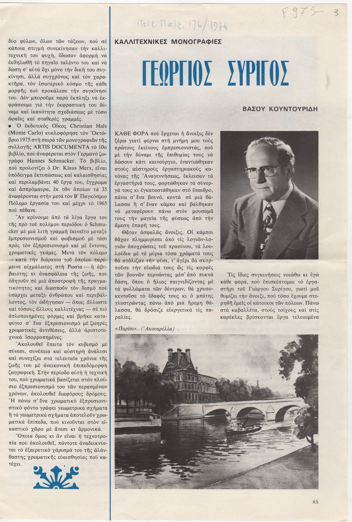 Απόκομμα, χαρτί ιλλουστρασιόν, 2 φφ, 33×24 εκ., στα ελληνικά, δημοσίευσης κειμένου για τη ζωή και το έργο του Γεώργιου Συρίγου.