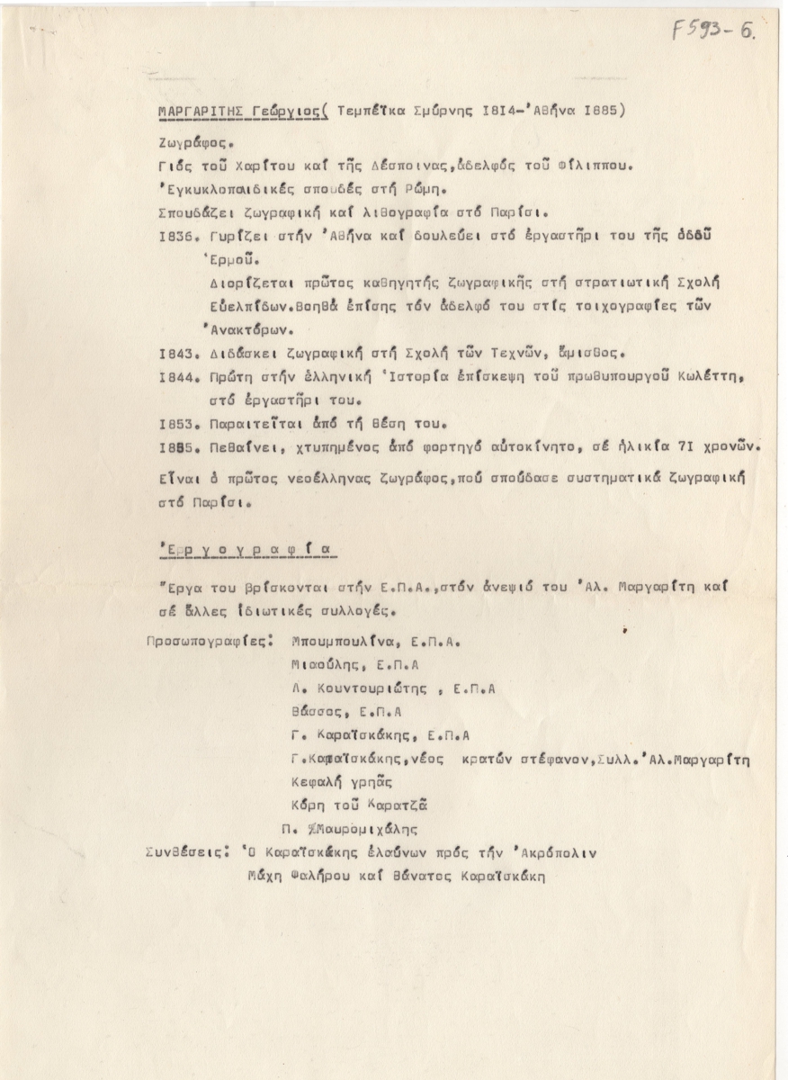 Βιογραφικό, δακτυλόγραφο, χαρτί, 2 φφ, 29,5×21 εκ., στα ελληνικά, του Γεώργιου Μαργαρίτη. Περιέχει τα σημαντικότερα γεγονότα της ζωής του, εργογραφία και βιβλιογραφία.