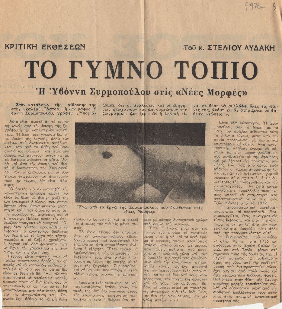 Απόκομμα, χαρτί, 22.5×21 εκ., στα ελληνικά, δημοσίευσης κριτικής έκθεσης της Υβόννης Συρμοπούλου, η οποία διεξάγεται στην γκαλερί Νέες Μορφές στην Αθήνα.