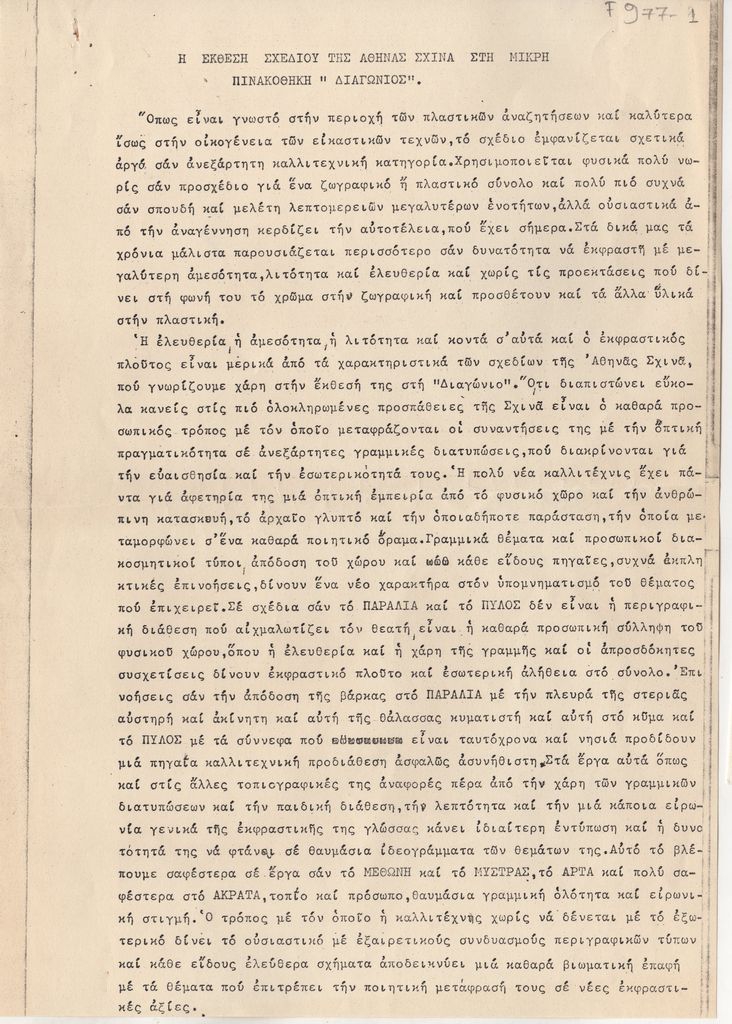 Κείμενο, χαρτί, δακτυλόγραφο, 29.5×21 εκ., στα ελληνικά, του Χρύσανθου Χρήστου για το έργο της Αθηνάς Σχινά, στο πλαίσιο έκθεσής της στην πινακοθήκη Διαγώνιος στην Θεσσαλονίκη.