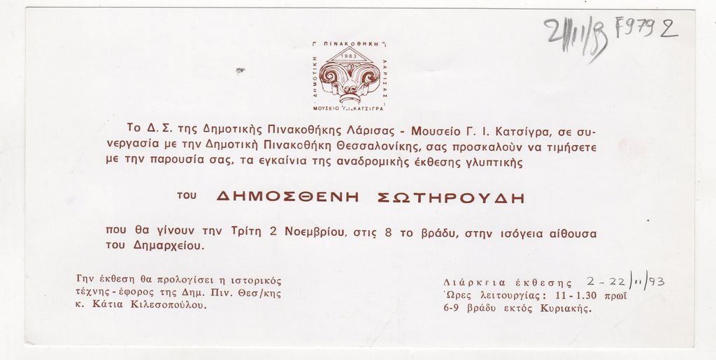 Πρόσκληση, χαρτόνι, 10×20 εκ., στα ελληνικά, εγκαινίων έκθεσης του Δημοσθένη Σωτηρούδη.
