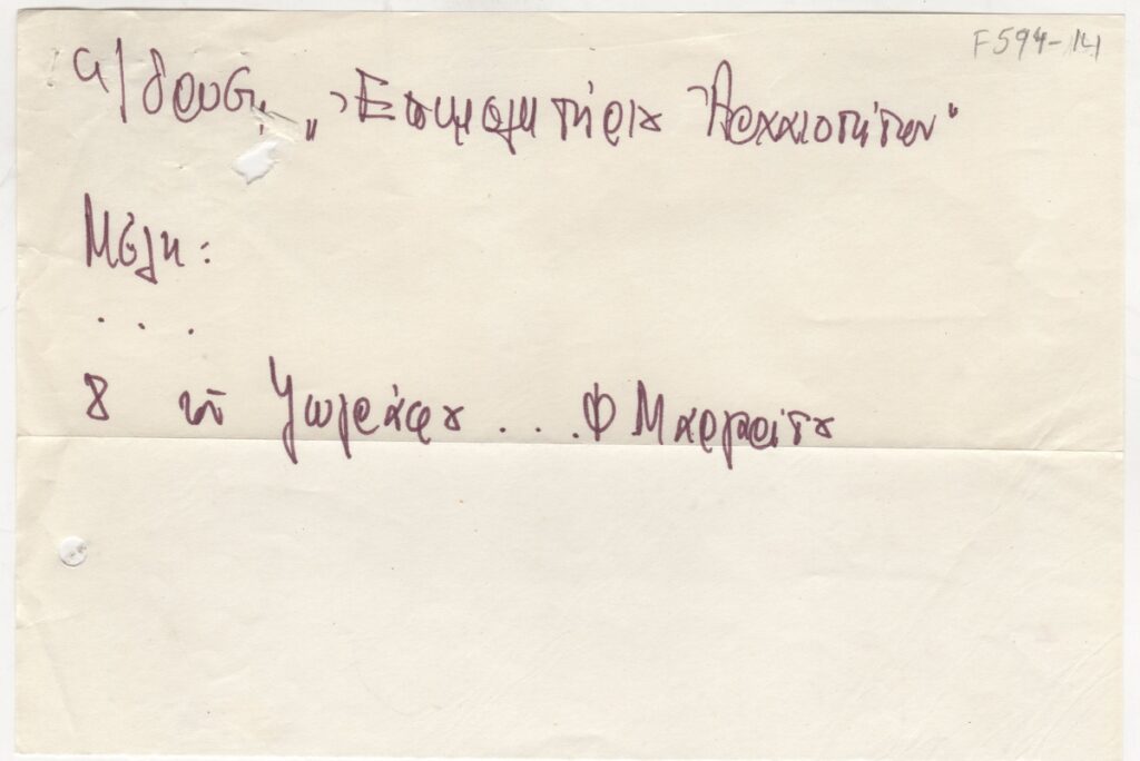 Σημείωμα, χειρόγραφο, χαρτί, 14,5×21,5 εκ., στα ελληνικά, με επιγραμματική αναφορά στην ίδρυση του Επιμελητηρίου Αρχαιοτήτων, μέλος του οποίου ο Φίλιππος Μαργαρίτης.