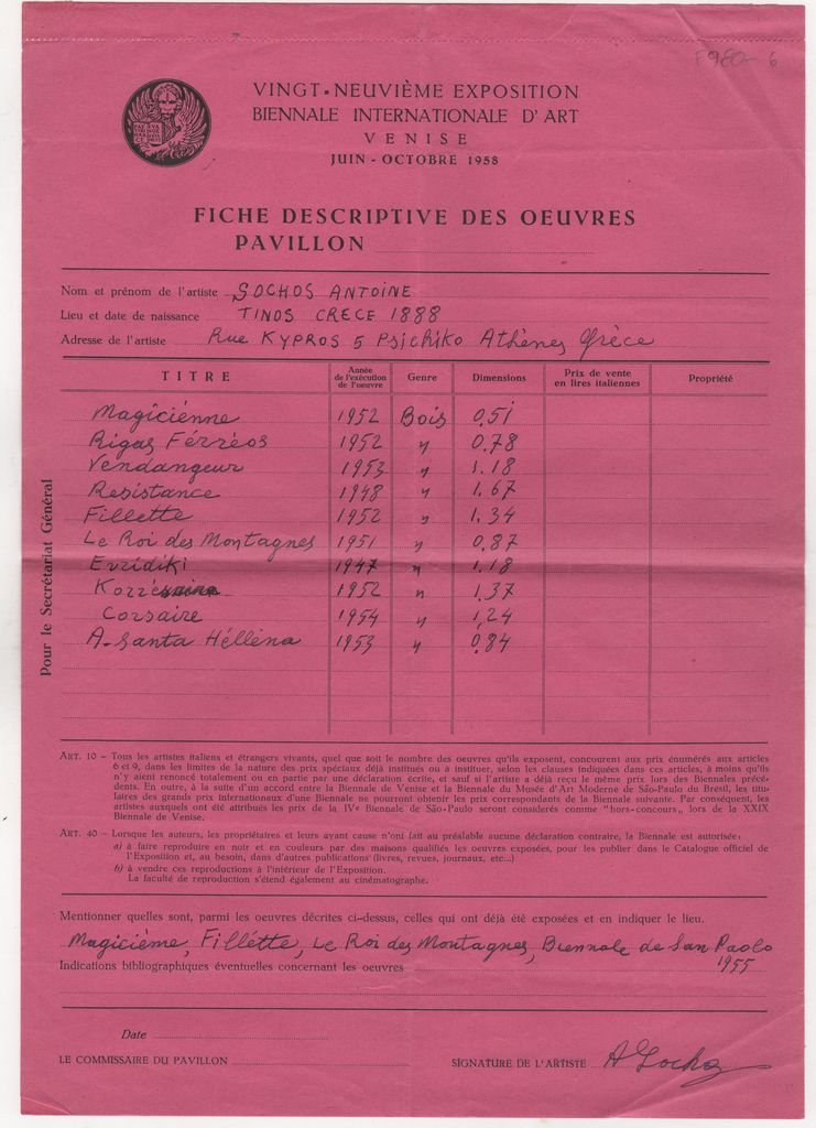 Δελτίο καταγραφής έργων, χαρτί, 34×24 εκ., στα γαλλικά, του Αντώνιου Σώχου, με τα οποία συμμετέχει στην 29η Μπιεννάλε της Βενετίας το 1958.