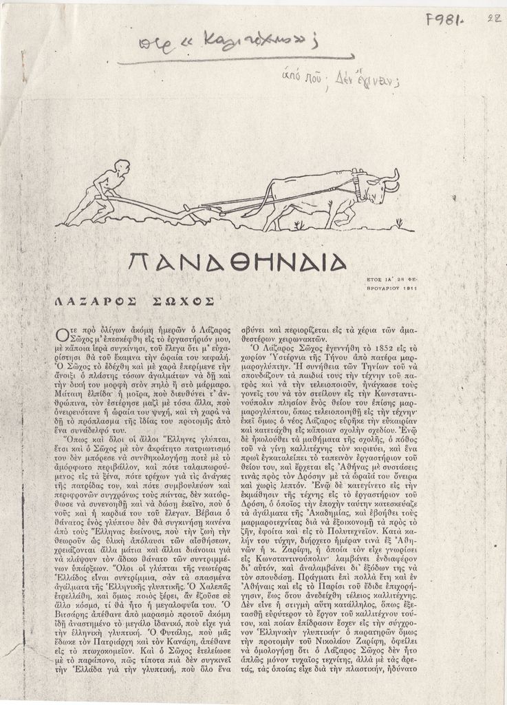 Το απόκομμα εικονογραφείται και φέρει χειρόγραφη επιγραφή.