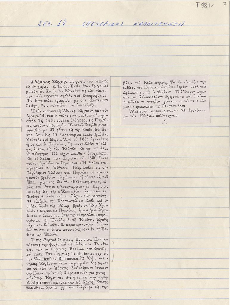 Φωτοαντίγραφο, χαρτί κολλημένο σε λευκή κόλλα, 29×21 εκ., στα ελληνικά, δημοσίευσης βιογραφικού σημειώματος του Λάζαρου Σώχου.