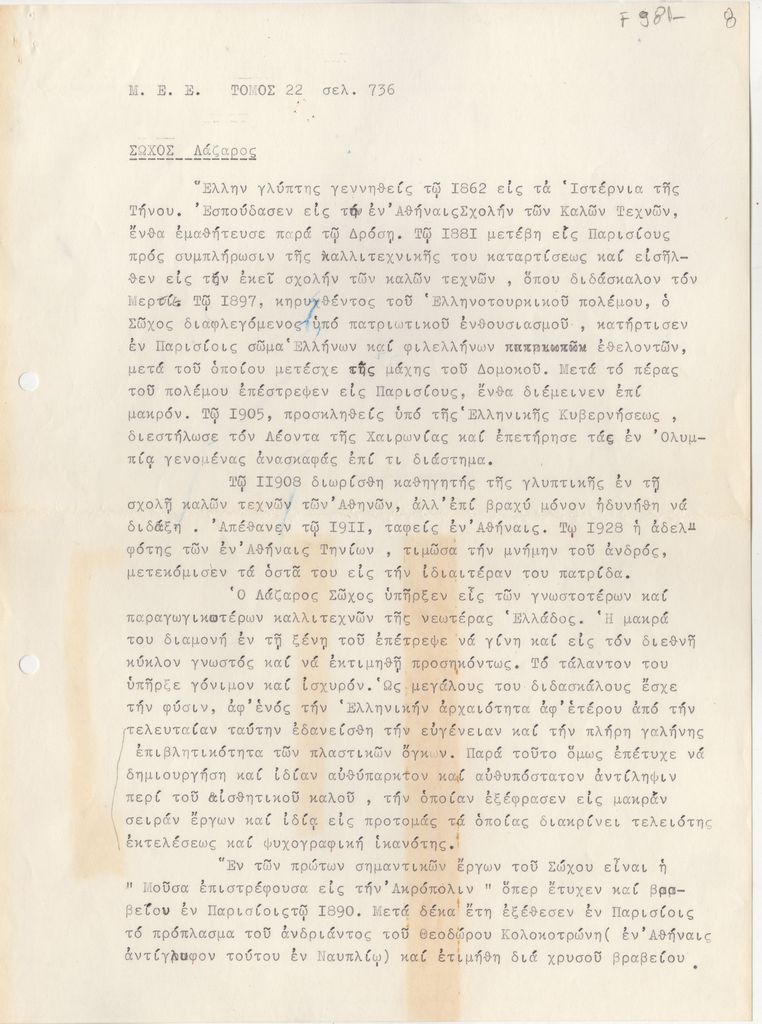 Αποδελτίωση λήμματος, δακτυλόγραφη, χαρτί, 2 φφ, 29×21 εκ., στα ελληνικά. Πρόκειται για βιογραφικό σημείωμα του Λάζαρου Σώχου.