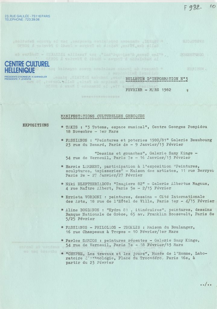 Δελτίο Τύπου, δακτυλόγραφο, χαρτί δίπλής όψης, 29.5×21 εκ., στα γαλλικά του Centre Culturel Hellénique του Παρισιού. Αναγράφονται οι πολιτιστικές εκδηλώσεις της περιόδου Φεβρουαρίου-Μαρτίου 1982 στο Παρίσι, όπου πρωτοστατούν Έλληνες καλλιτέχνες. Ειδικότερα, αναγράφονται εκθέσεις των Τάκη, Φασιανού, Λάμπερτ, Ελευθεριάδου, Βορδώνη, Μπογδάνου, Φιλόλαου, Τσόκλη, Σάμιου και ομαδικής με θέμα την Κύπρο. Επίσης, μουσικό θεάμα αφιερωμένο στο ρεμπέτικο, μουσική βραδιά νέων καλλιτεχνών και διάλεξη του Βασίλη Αλεξάκη.