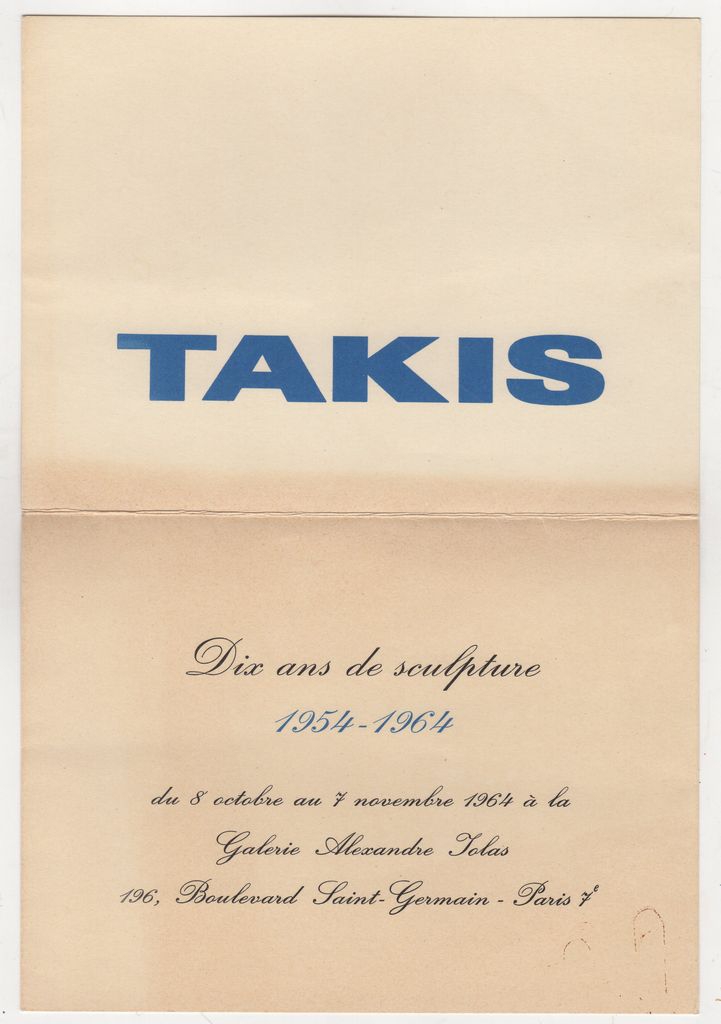 Πρόσκληση, χαρτόνι αναδιπλωμένο, 12,5×17 εκ., στα γαλλικά, εγκαινίων έκθεσης του Τάκη (Παναγιώτη Βασιλάκη).