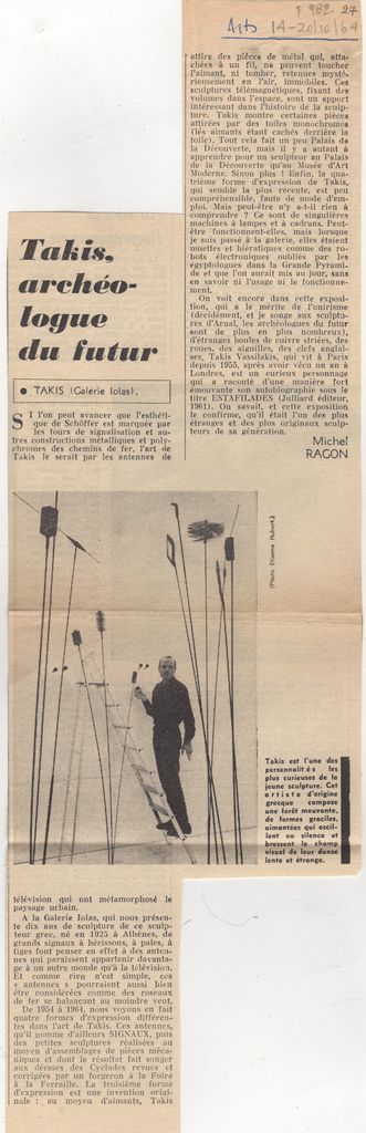 Απόκομμα, χαρτί ακανόνιστου μεγέθους, στα γαλλικά, δημοσίευσης κριτικής έκθεσης του Τάκη (Παναγιώτη Βασιλάκη) στην γκαλερί Ιόλα στο Παρίσι.