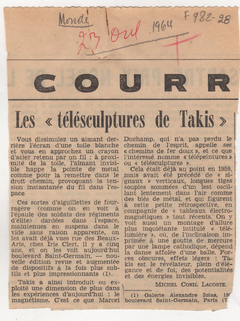 Απόκομμα, χαρτί, 13×10 εκ., στα γαλλικά, δημοσίευσης κριτικής έκθεσης του Τάκη (Παναγιώτη Βασιλάκη) στην γκαλερί Ιόλα στο Παρίσι.