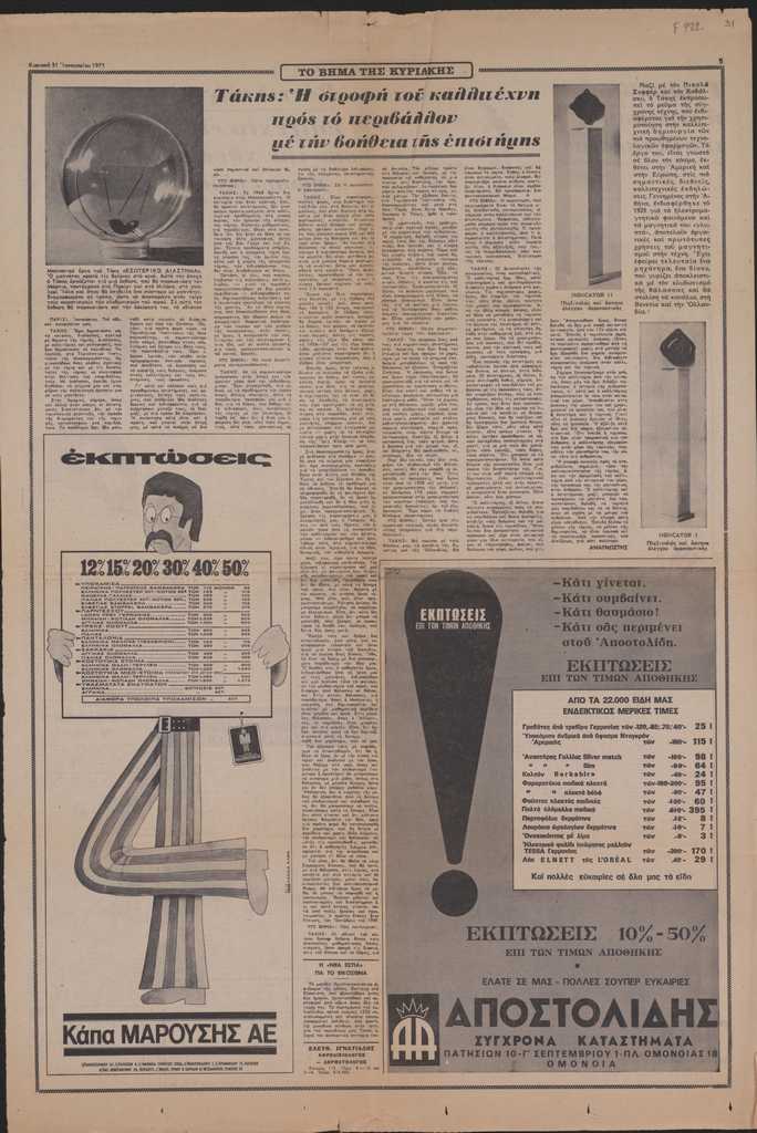 Απόκομμα, χαρτί, 64×43 εκ., στα ελληνικά, δημοσίευσης συνέντευξης του Τάκη (Παναγιώτη Βασιλάκη). Ο καλλιτέχνης με αφορμή εκθέσεις που προετοιμάζει να ανεβούν στην γκαλερί Ιόλα στο Παρίσι και Μιλάνο, μιλάει για το έργο του που συνδυάζει την Τέχνη με την Επιστήμη.
