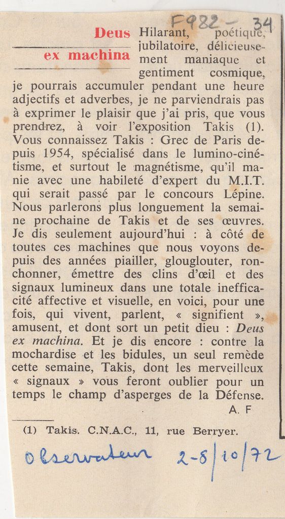 Απόκομμα, χαρτί, 13×7 εκ., στα γαλλικά, δημοσίευσης κριτικής έκθεσης του γλύπτη Τάκη (Παναγιώτη Βασιλάκη), η οποία διεξάγεται στην C. N. A. C. στο Παρίσι.