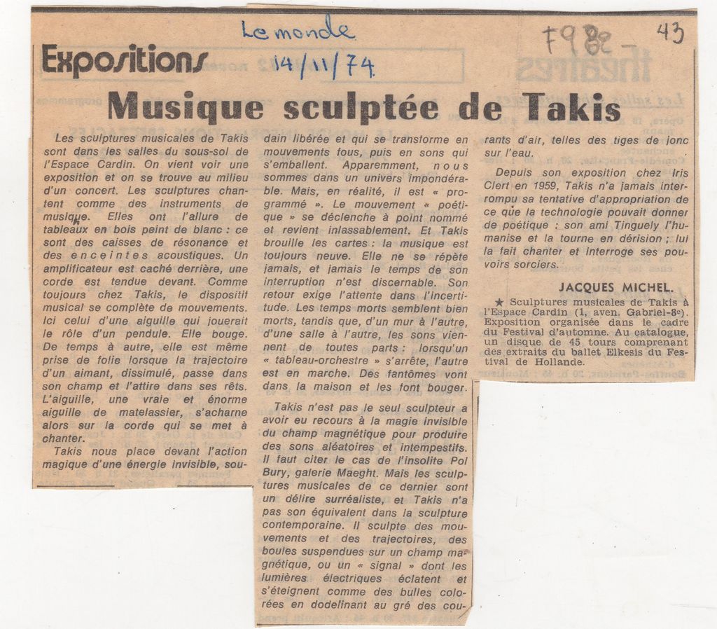 Απόκομμα, χαρτί ακανόνιστου μεγέθους, στα ελληνικά, δημοσίευσης άρθρου αναφερόμενου σε έκθεση έργων μουσικοκινητικής τέχνης του Τάκη (Παναγιώτη Βασιλάκη) στο Espace Cardin στο Παρίσι στο πλαίσιο του Festival d’ Automne.
