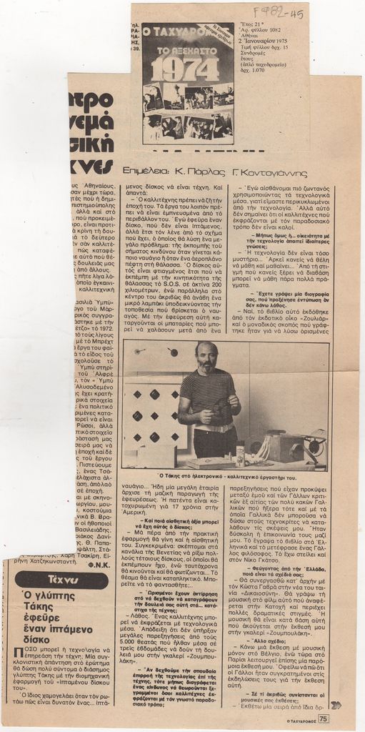 Απόκομμα, χαρτί διπλής όψης ακανόνιστου μεγέθους, στα ελληνικά, δημοσίευσης συνέντευξης του γλύπτη Τάκη (Παναγιώτη Βασιλάκη), με αφορμή “Ιπτάμενο Δίσκο” του καλλιτέχνη, έργο του που συνδυάζει τη μουσική με τη γλυπτική. Ο Τάκης μιλά για το έργο του, για την Τέχνη του και για την νεοελληνική Τέχνη.