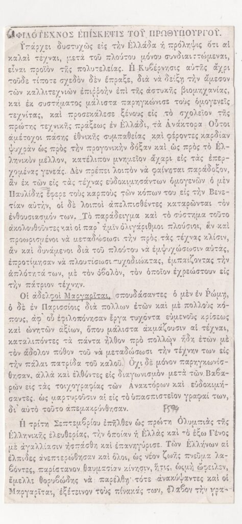 Φωτοαντίγραφο, χαρτί, 3 φφ και χειρόγραφο πρόσθετο σημείωμα, στα ελληνικά, 18×8,5 και 4,5×5,5 εκ., με άρθρο που αναφέρεται στο έργο των αδερφών Μαργαρίτη (Γεωργίου και Φίλιππου) και στην επίσκεψη του πρωθυπουργού Ιωάννη Κωλέττη στα καλλιτεχνικά εργαστήριά τους.