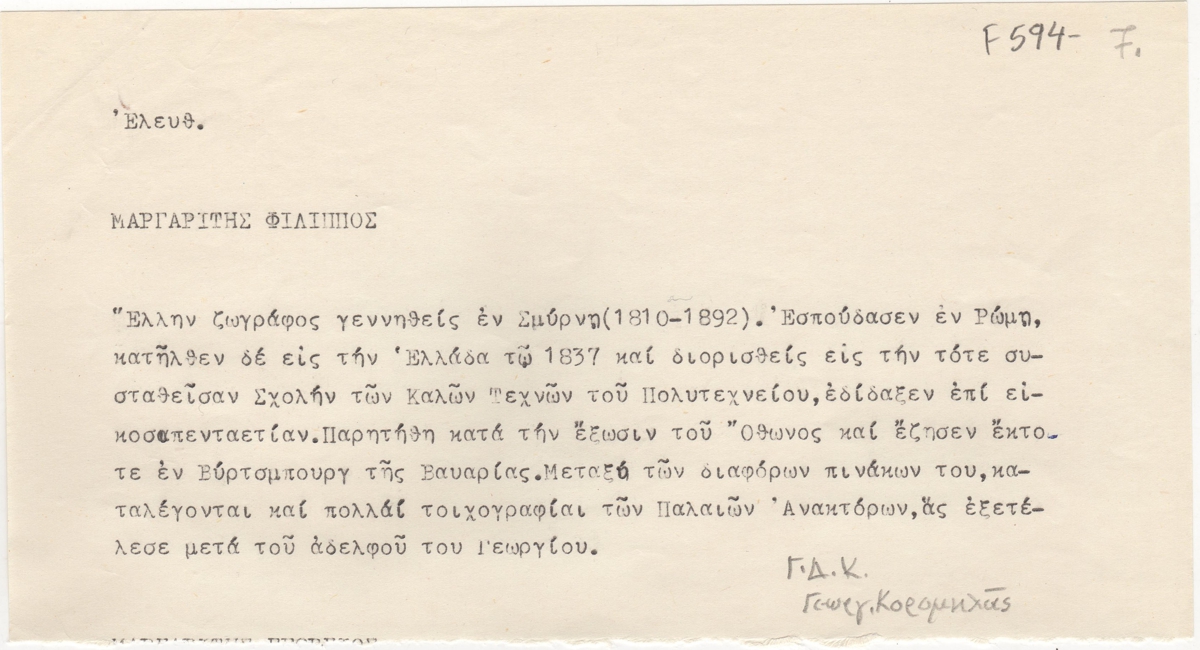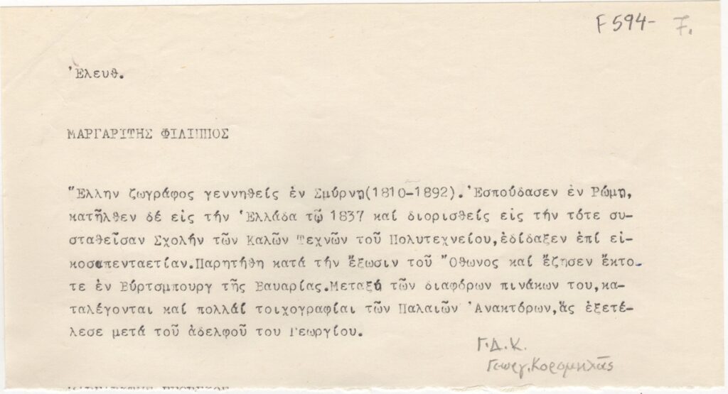 Αποδελτίωση, δακτυλόγραφο, χαρτί, 11,5×21,5 εκ., στα ελληνικά, λήμματος για τον Φίλιππο Μαργαρίτη. Αναγράφονται σπουδές, καλλιτεχνική δραστηριότητα και έργα του καλλιτέχνη.