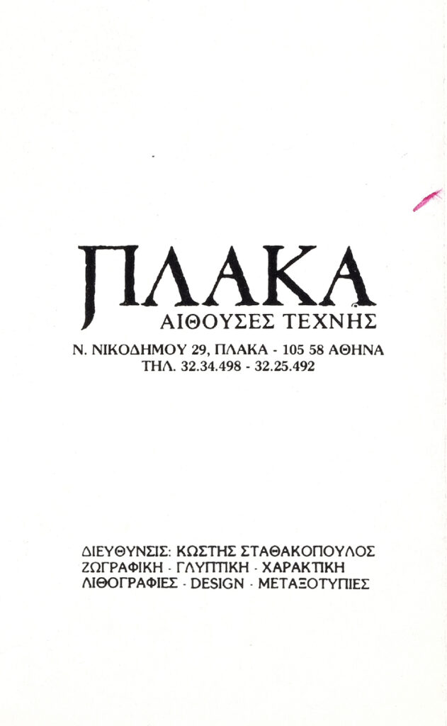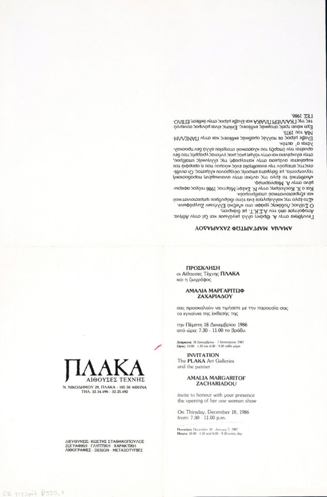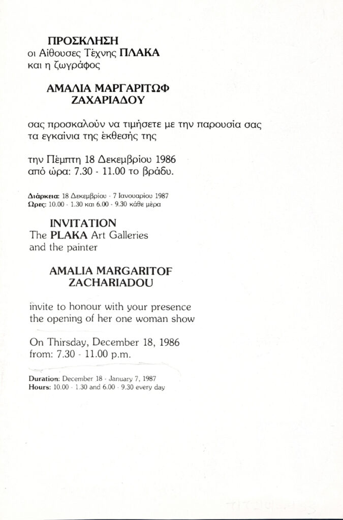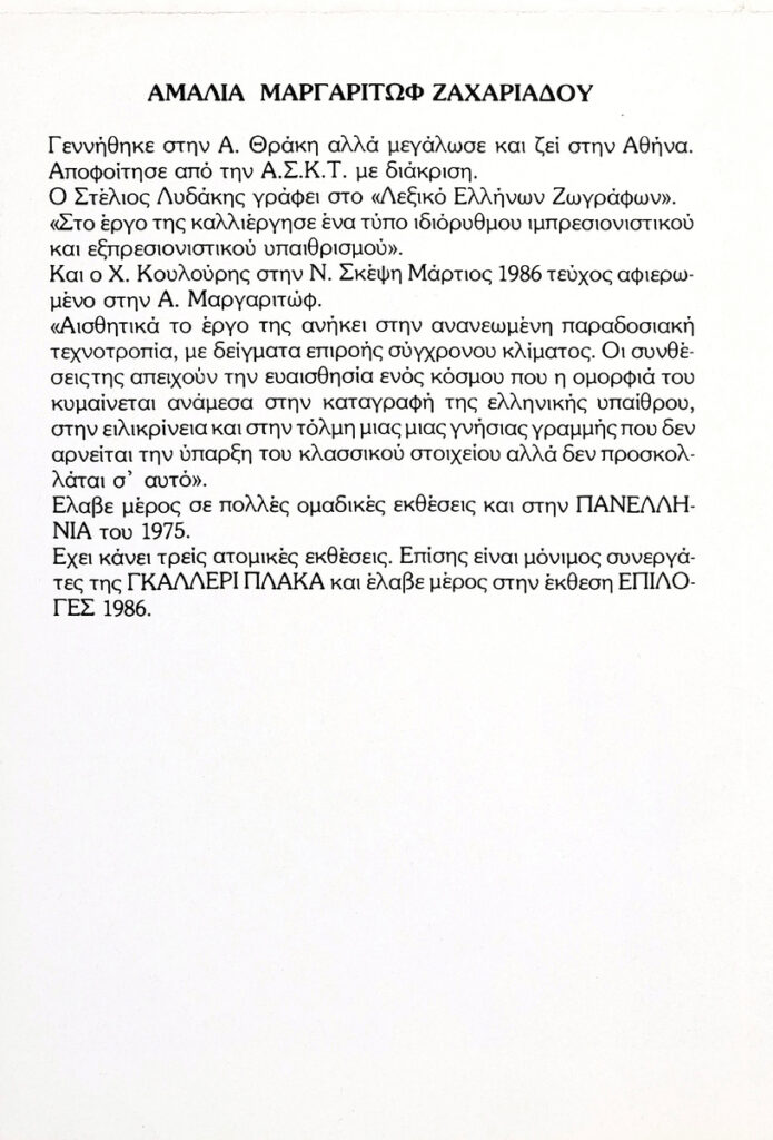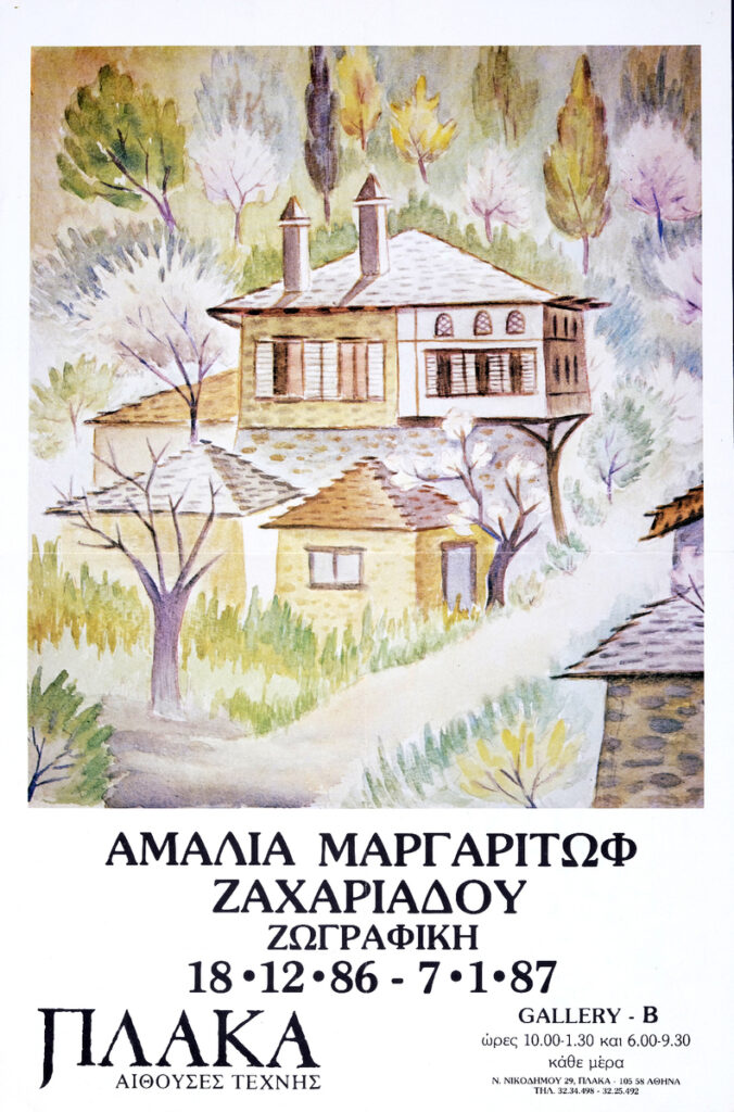 Αφίσα της ατομικής έκθεσης ζωγραφικής της Αμαλίας Μαργαριτώφ-Ζαχαριάδου στην Γκαλερί “Πλάκα” στην Αθήνα.
