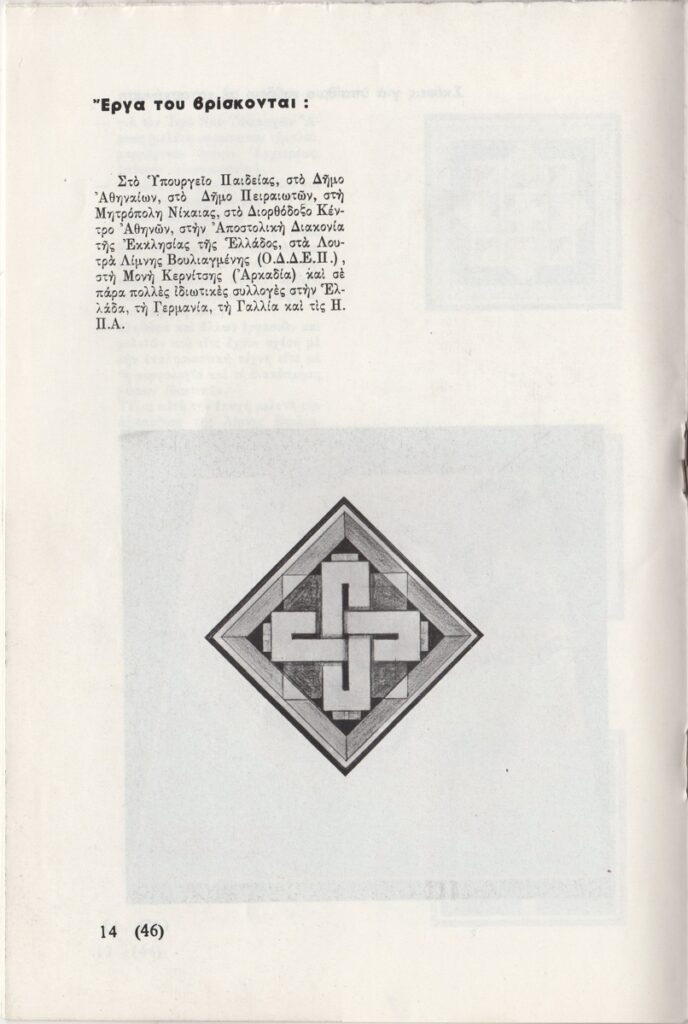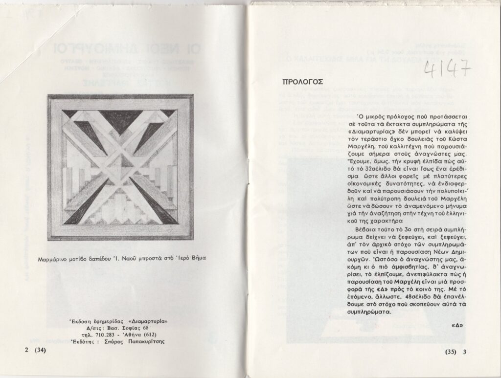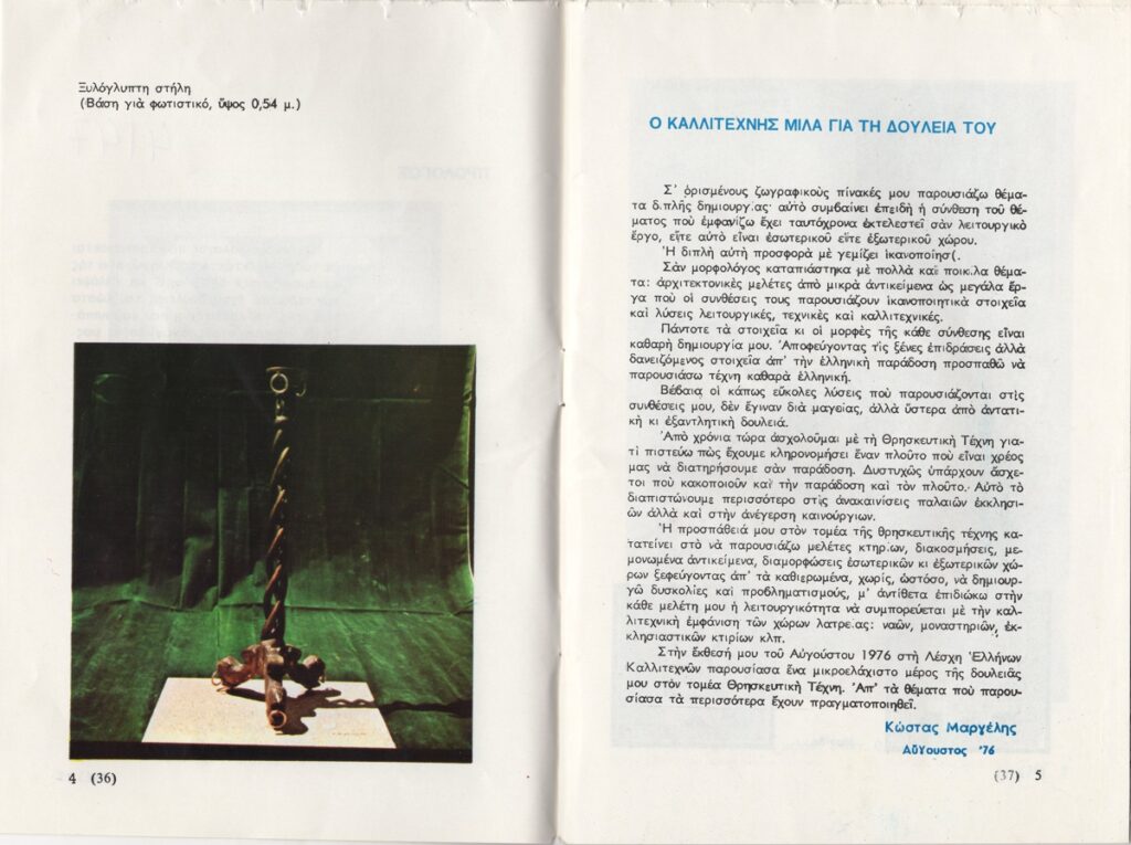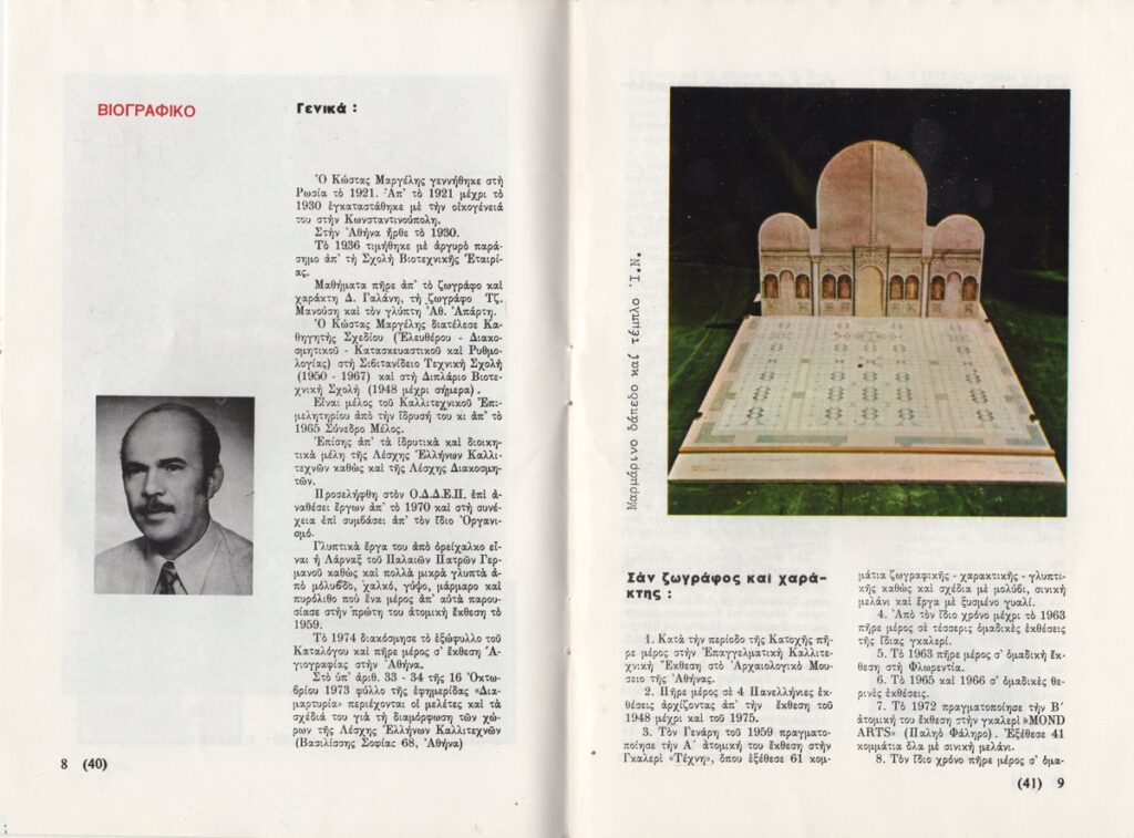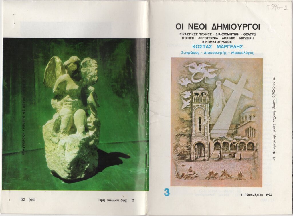 Έντυπο, χαρτί ιλλουστρασιόν, 16 φφ, 21×14 εκ., στα ελληνικά, αφιερωμένο στον Κώστα Μαργέλη. Περιέχει εισαγωγικό κείμενο, κείμενο του καλλιτέχνη για το έργο του, βιογραφικό σημείωμα, αποσπάσματα κριτικών στον Τύπο και εικονογράφηση.