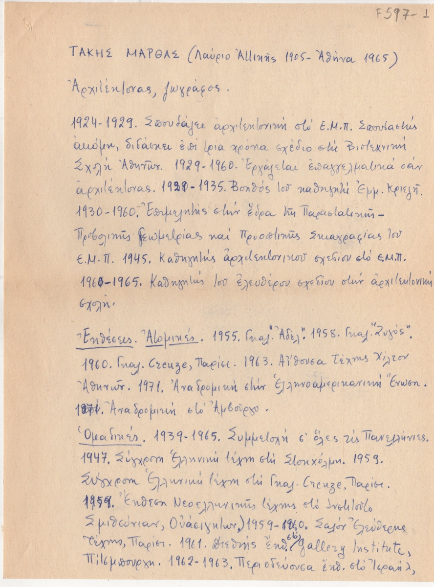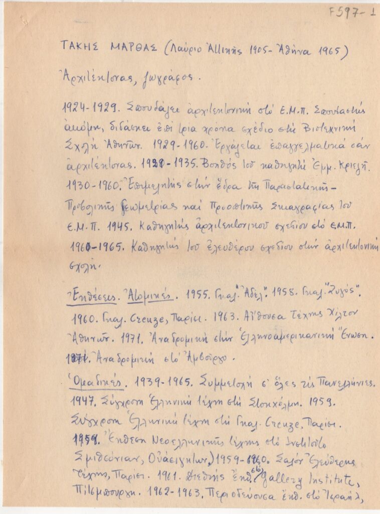 Βιογραφικό, χειρόγραφο, χαρτί, 3 φφ, 28×21 εκ., στα ελληνικά, του Τάκη Μάρθα. Περιέχει σπουδές, καλλιτεχνική δραστηριότητα, εκθέσεις, εργογραφία και βιβλιογραφία για τον καλλιτέχνη.