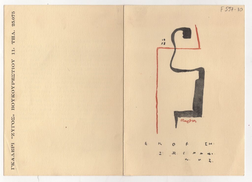 Έντυπο, χαρτόνι αναδιπλωμένο, 17×12 εκ., στα ελληνικά, ατομικής έκθεσης του Τάκη Μάρθα. Περιέχει κείμενο του καλλιτέχνη για το εκτιθέμενο έργο και χειρόγραφη αφιέρωση προς το ζεύγος Σπητέρη. Εικονογραφείται.