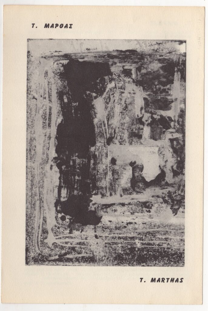Έντυπο, χαρτί διπλής όψεως, 21,5×14,5 εκ., στα ελληνικά και αγγλικά, το οποίο προέρχεται πιθανώς από έκθεση του Τάκη Μάρθα. Περιέχει βιογραφικό με λίστα εκθέσεων και αποσπάσματα του Τύπου της περιόδου 1958-1959, με κριτικές έργων που παρουσίασε σε εκθέσεις του.