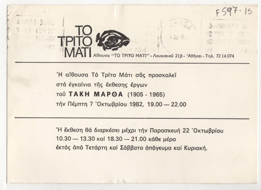 Πρόσκληση, χαρτόνι, 12,5×17,5 εκ., στα ελληνικά, εγκαινίων ατομικής έκθεσης του Τάκη Μάρθα. Η πρόσκληση βρέθηκε απεσταλμένη στο ζεύγος Σπητέρη.