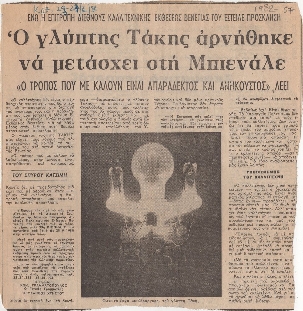Απόκομμα, χαρτί, 21×20 εκ., στα ελληνικά, δημοσίευσης άρθρου αναφερόμενου στην άρνηση συμμετοχής του γλύπτη Τάκη (Παναγιώτη Βασιλάκη) στην Μπιεννάλε Βενετίας 1980.