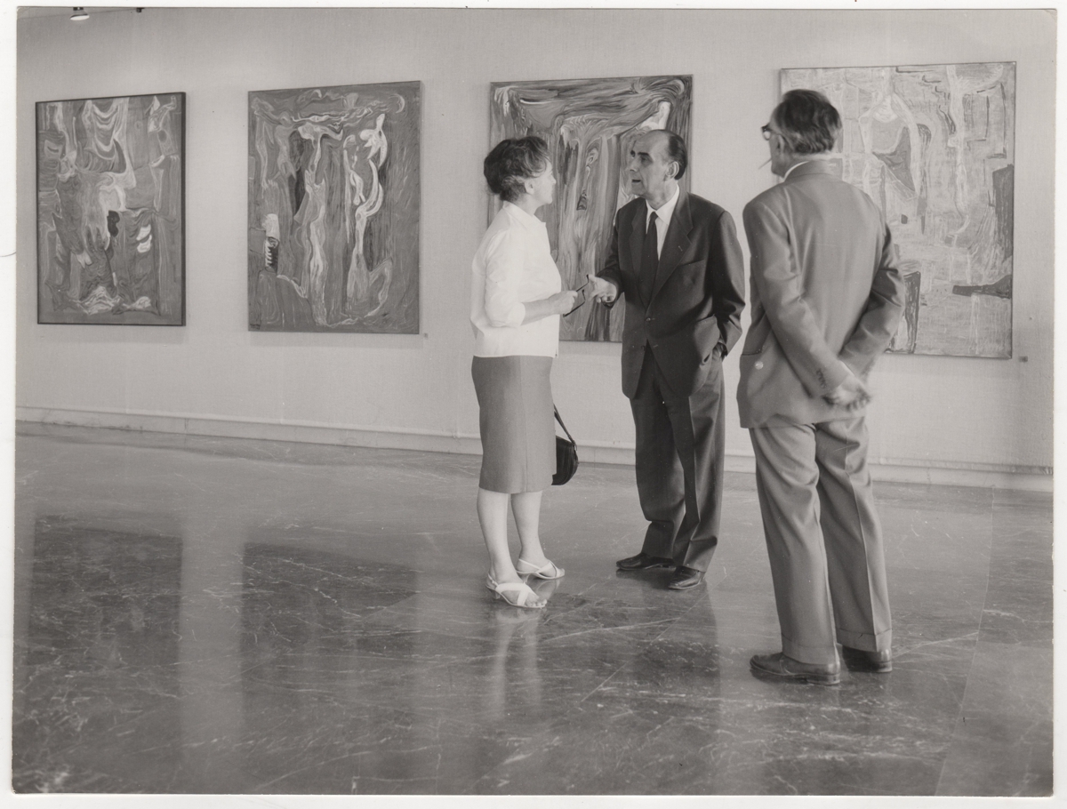 Φωτογραφία, α/μ, φωτογραφικό χαρτί, 18×23,5 εκ., με εικονιζόμενους τους Τάκη Μάρθα, Άννα Κινδύνη και Γιώργο Μαρουδή μπροστά από έργα του καλλιτέχνη.