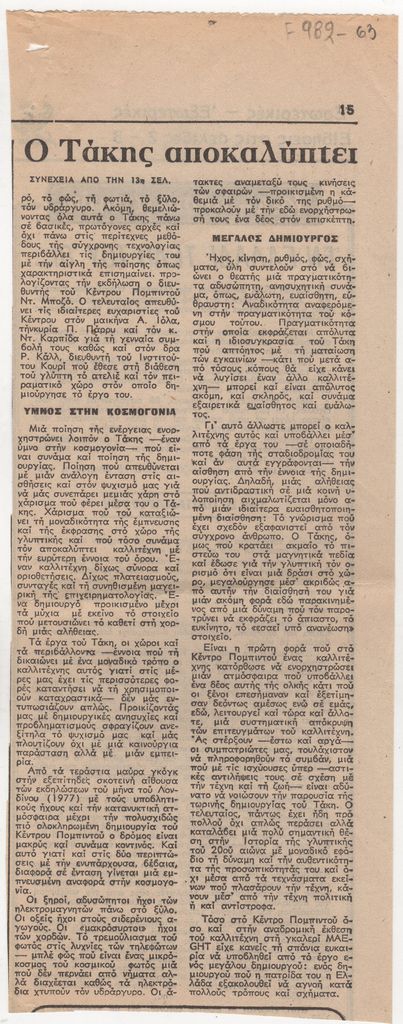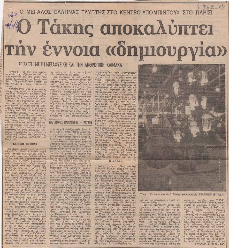 Απόκομμα, χαρτί, 2 φφ, 28×21 και 28×11 εκ., στα ελληνικά, δημοσίευσης κριτικής έκθεσης του γλύπτη Τάκη (Παναγιώτη Βασιλάκη), που παρουσιάζει στο Παρίσι.