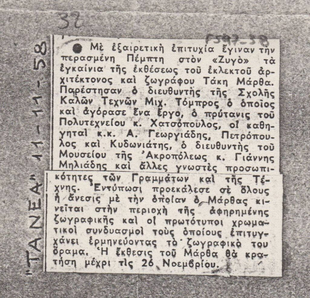 Φωτοαντίγραφο, χαρτί, 30×21 εκ., στα ελληνικά, δημοσίευσης κριτικής έκθεσης του Τάκη Μάρθα, η οποία διεξάγεται στην Γκαλερί Ζυγός στην Αθήνα.