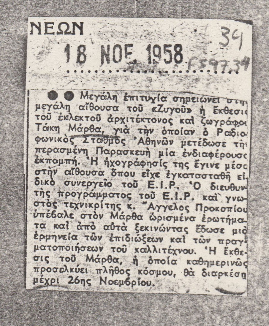 Φωτοαντίγραφο, χαρτί, 31×20 εκ., στα ελληνικά, δημοσίευσης άρθρου αναφερόμενου σε επιτυχία έκθεσης ζωγραφικής του Τάκη Μάρθα στην Γκαλερί Ζυγός στην Αθήνα. Σημειώνεται επίσης συνέντευξη του καλλιτέχνη στο Ραδιοφωνικό Σταθμό Αθηνών.
