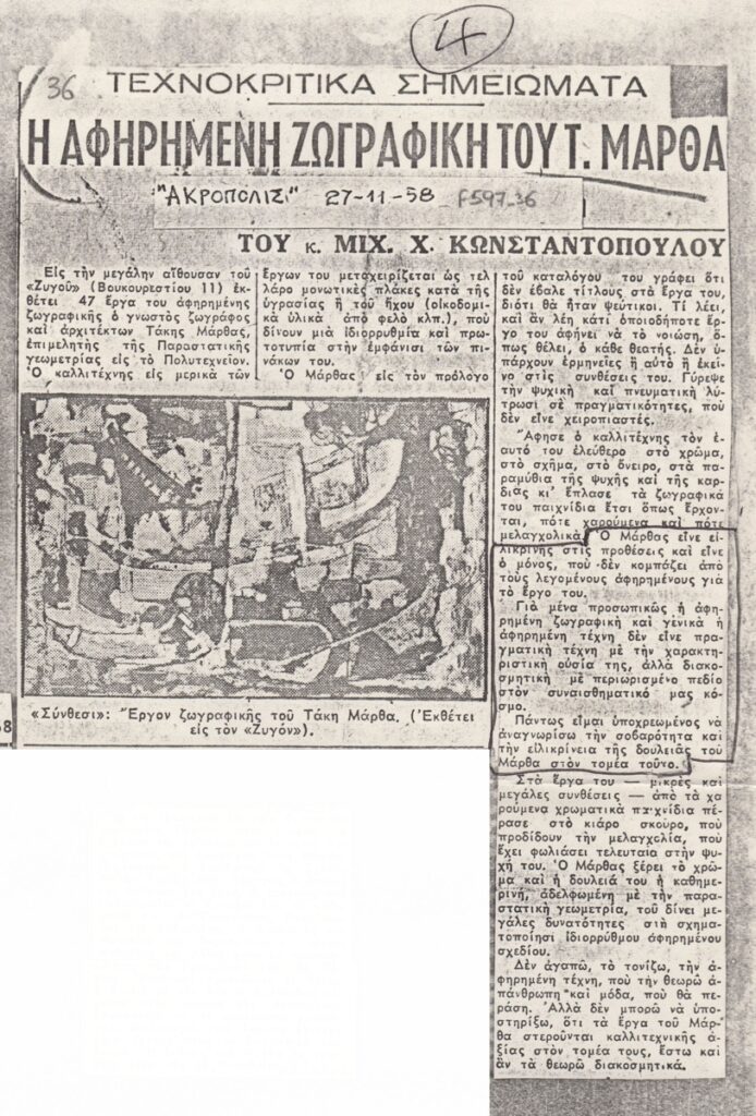 Φωτοαντίγραφο, χαρτί, 30×21 εκ., στα ελληνικά, δημοσίευσης κριτικής για το έργο που παρουσιάζει ο Τάκης Μάρθας σε ατομική του έκθεση στην γκαλερί Ζυγός στην Αθήνα το 1958. Εντάσσεται στη στήλη “Τεχνοκριτικά Σημειώματα” του εντύπου. Το απόκομμα εικονογραφείται και φέρει επιγραφές.