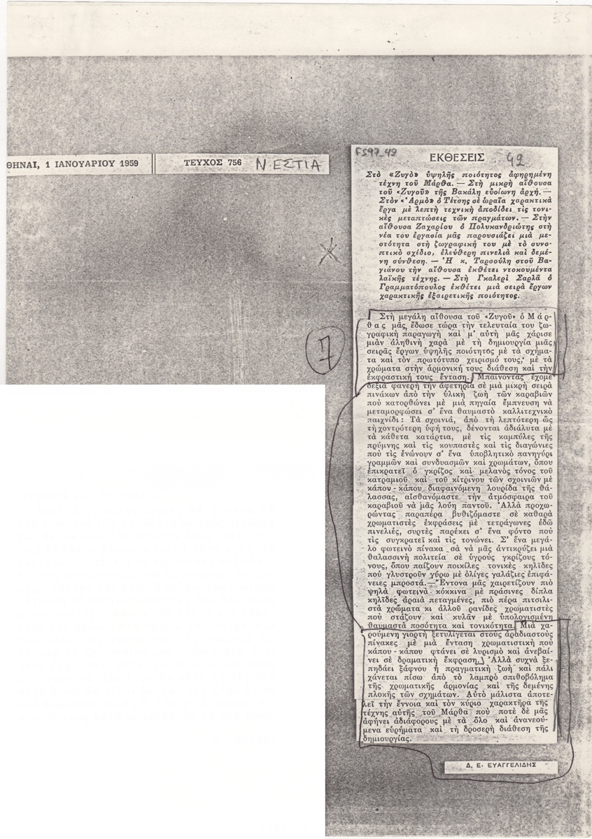 Φωτοαντίγραφο, 30×21 εκ., στα ελληνικά, δημοσίευσης κριτικής ατομικής έκθεσης του Τάκη Μάρθα στην γκαλερί Ζυγός στην Αθήνα. Στο ίδιο, δίνονται επιγραμματικές πληροφορίες για τις εκθέσεις των Βακάλη στον Ζυγό, Τέτση στον Αρμό, Πολυκανδριώτη στην αίθουσα Ζαχαρίου, Ταρσούλη στην αίθουσα Βαγιάνου και Γραμματόπουλου στην γκαλερί Σάρλα.
