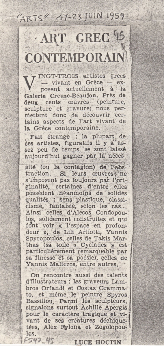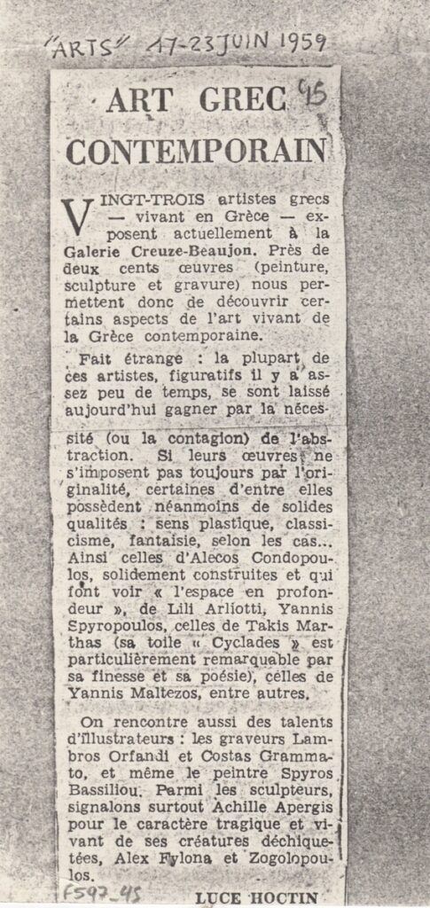 Φωτοαντίγραφο, χαρτί, 30×21 εκ., στα γαλλικά, δημοσίευσης κριτικής ομαδικής έκθεσης Ελλήνων καλλιτεχνών στην γκαλερί Creuze στο Παρίσι. Στην έκθεση συμμετέχουν με έργα τους οι Απέργης, Αρλιώτη, Βακαλό, Βασιλείου, Γραμματόπουλος, Ζογγολόπουλος, Ζογγολοπούλου, Κανιάρης, Κεσσανλής, Κοντόπουλος, Κυριάκη, Λαμέρας, Μάρθας, Μαλτέζος, Μηταράκης, Μπεκιάρη, Μυλωνά, Ορφανός, Παπά, Σπυρόπουλος, Τόμπρος.