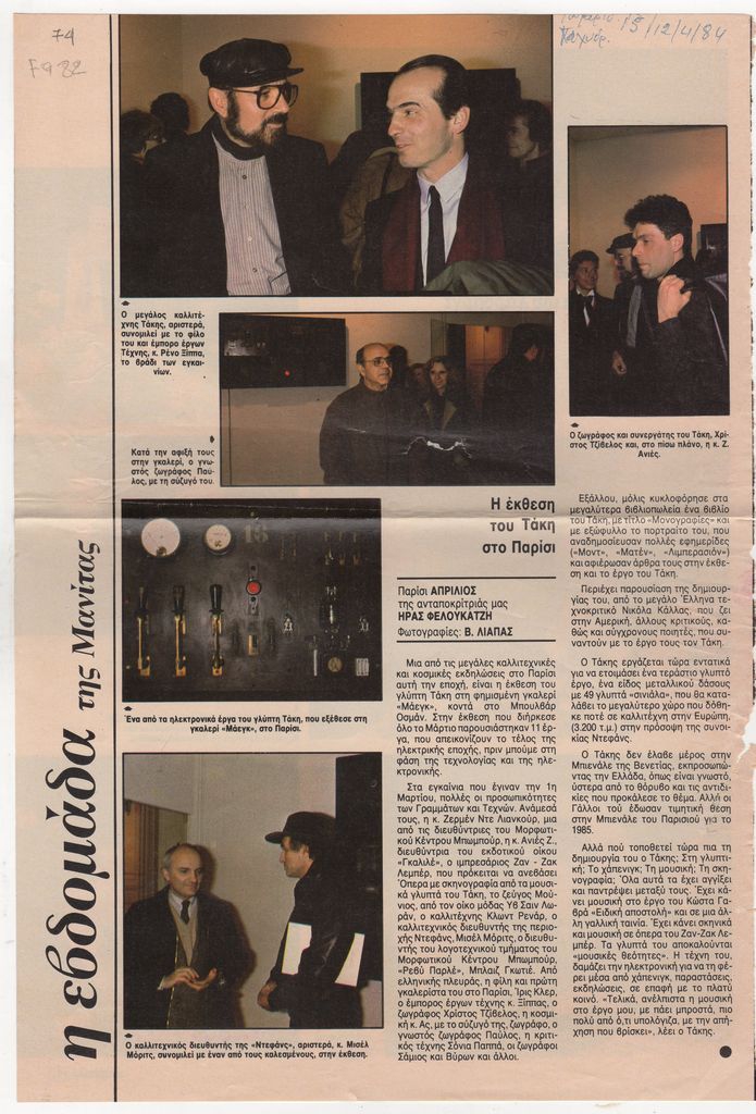 Απόκομμα, χαρτί, 32×22 εκ., στα ελληνικά, δημοσίευσης στήλης “Η εβδομάδα της Μανίτας”. Δίνεται φωτογραφικό υλικό από τα εγκαίνια και πληροφορίες για την έκθεση του γλύπτη Τάκη (Παναγιώτη Βασιλάκη), η οποία πραγματοποιήθηκε στην γκαλερί Lelong Maeght.